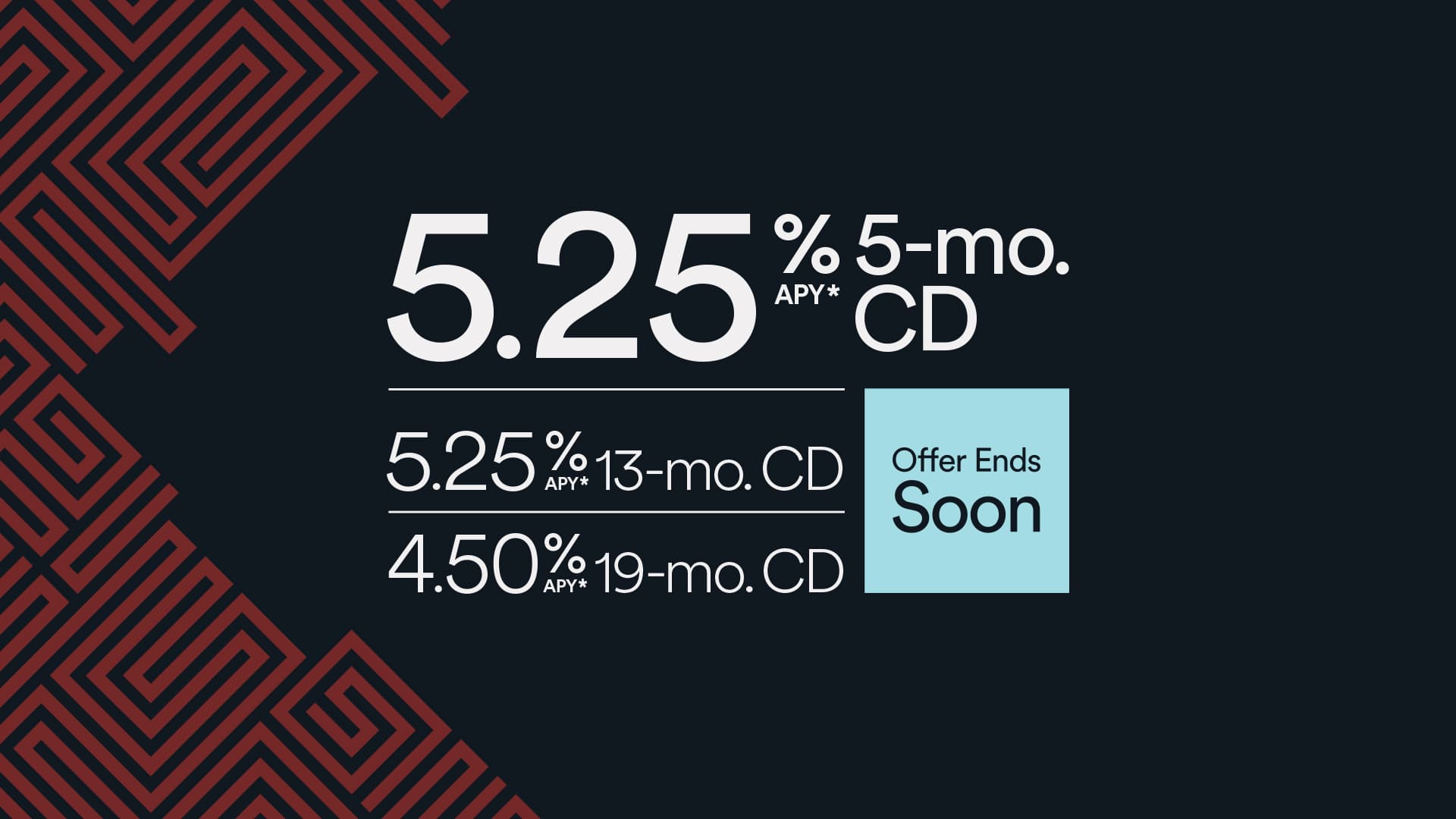 *Annual Percentage Yield. Rates are subject to change without notice. Interest is computed daily and paid monthly. Penalties apply for early withdrawal. Annual Percentage Yield is based on minimum account balance of $500.00. Upon maturity, certificates may be renewed automatically for the same term and at the current rate. Amount of penalty for early withdrawal on the amount withdrawn for Regular CDs, Jumbo CDs and IRA CDs is 90 days interest on CDs of 12 months or less, and 180 days interest on CDs over 12 months. Penalty may reduce principal. **Offer available to new and existing members on Certificate of Deposit (CD) accounts. Individual Retirement Accounts (IRA) CDs are included in this offer. Membership eligibility and restrictions apply. Federally insured by NCUA. Annual Percentage Yield (APY) is effective as of 3-2-2026. This is a limited-time offer, and we reserve the right to modify or cancel the terms and conditions of the CD Offering at any point without notice. The minimum balance requirement to open a 5-month CD or IRA CD and earn the advertised fixed APY rate of 3.25% is $500.